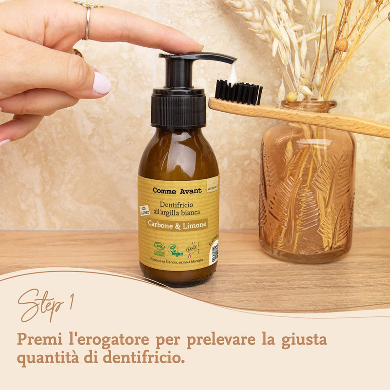 Carbone vegetale attivo: aiuta a purificare la bocca e ad attenuare le macchie superficiali, contribuendo a mantenere il colore naturale dei denti. Certificato COSMOS, origine Francia.