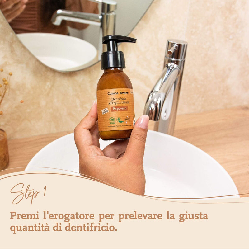 Argilla bianca: l'argilla bianca, o caolino, è un detergente delicato che aiuta a rimuovere le impurità da denti e gengive. Remineralizza e lenisce le gengive sensibili. Certificato Cosmos, origine Francia