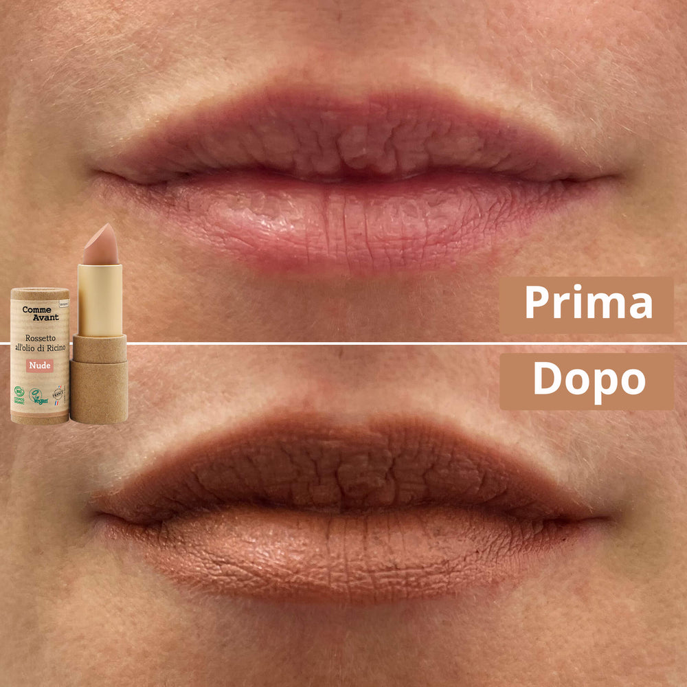 Elenco INCI del rossetto Nude: Burro di semi di Astrocaryum Murumuru, Euphorbia Cerifera Cera,Gliceril isostearato, ossido di zinco, olio di semi di Ricinus communis, copolimero di capriloil glicerina/acido sebacico, CI 77491, CI 77492, CI 77499