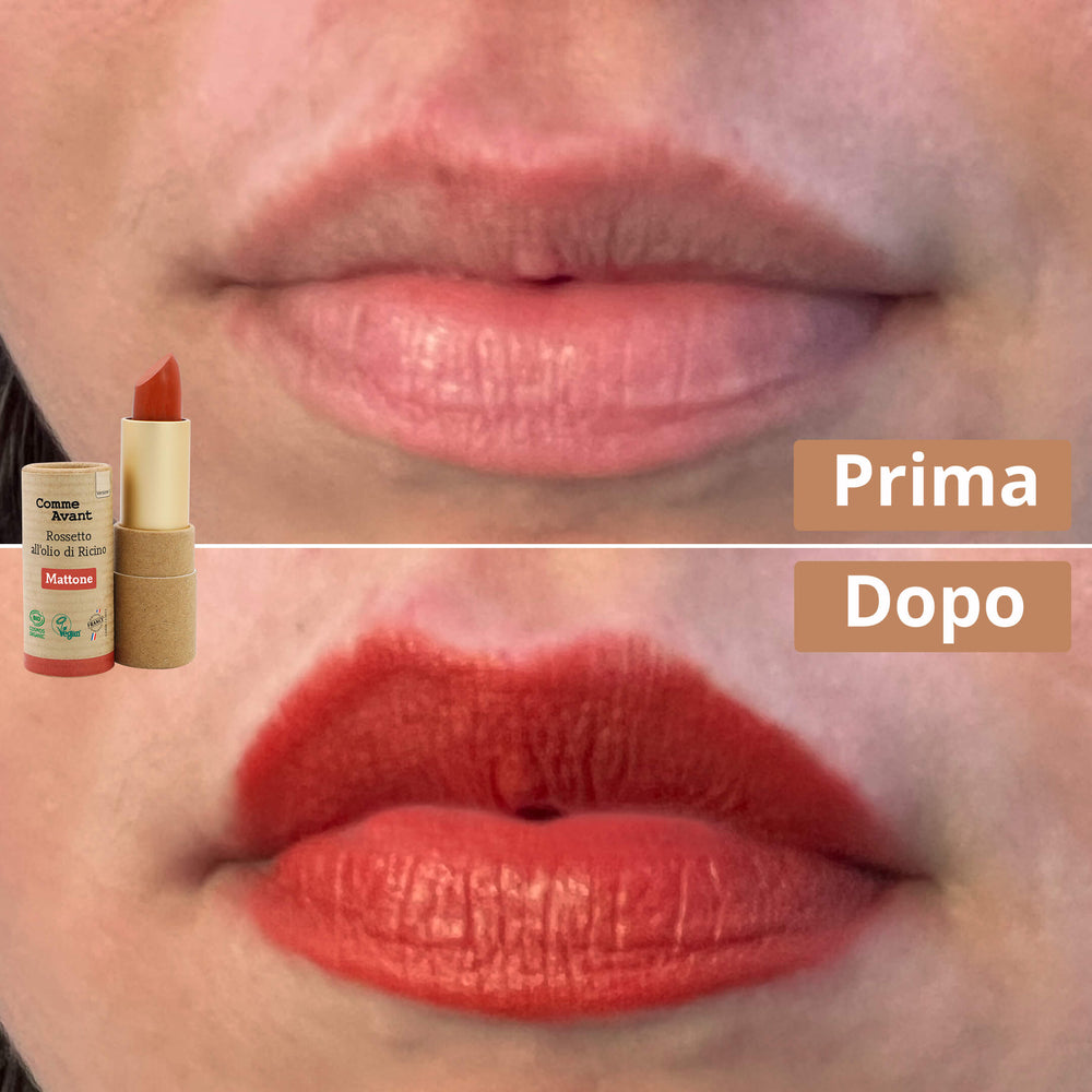 Elenco INCI del rossetto Mattone: Astrocaryum Murumuru Seed Butter, Euphorbia Cerifera Cera, CI 77491, Glyceryl Isostearate, Ricinus Communis Seed Oil, Capryloyl Glycerin / Sebacic Acid Copolymer