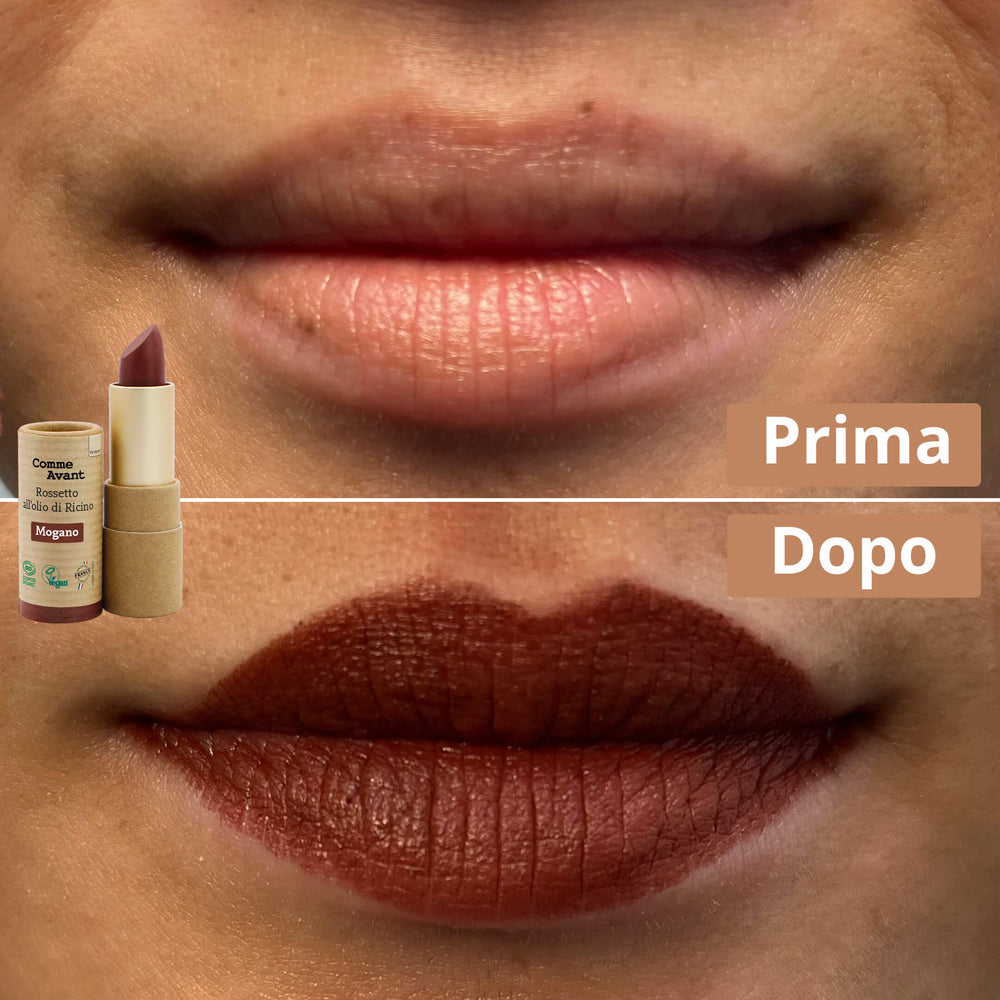 Elenco INCI del rossetto Mogano: Burro di semi di Astrocaryum Murumuru, Euphorbia Cerifera Cera, Gliceril Isostearato, Olio di semi di Ricinus Communis, Copolimero di Capriloil Glicerina/Acido Sebacico, CI 77007, CI 77491, Caolino