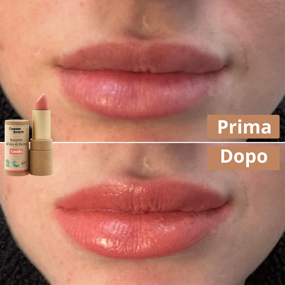 Elenco INCI del rossetto Corallo: Burro di semi di Astrocaryum Murumuru, Euphorbia Cerifera Cera, Gliceril Isostearato, Ossido di Zinco, Olio di semi di Ricinus Communis, Copolimero di Capriloil Glicerina/Acido Sebacico, CI 77491