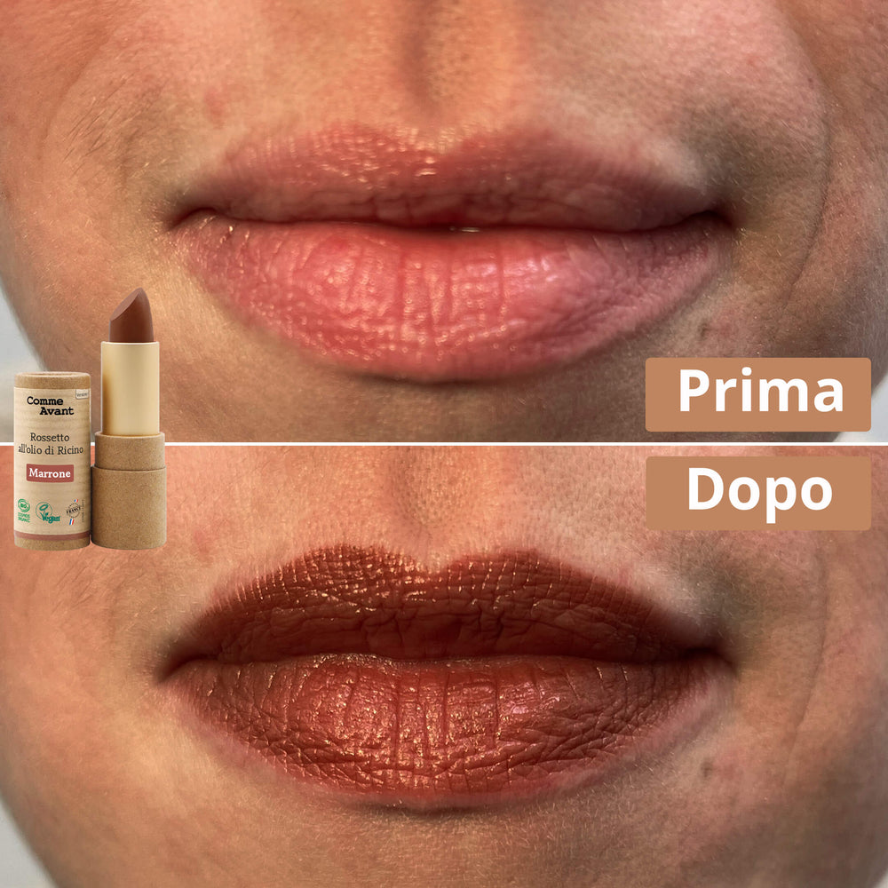 Elenco INCI del rossetto Marrone: Burro di semi di Astrocaryum Murumuru, Euphorbia Cerifera Cera (cera)*, Gliceril Isostearato, Olio di semi di Ricinus Communis, Copolimero di Capriloil Glicerina/Acido Sebacico, CI 77491, CI 77492, CI 77499