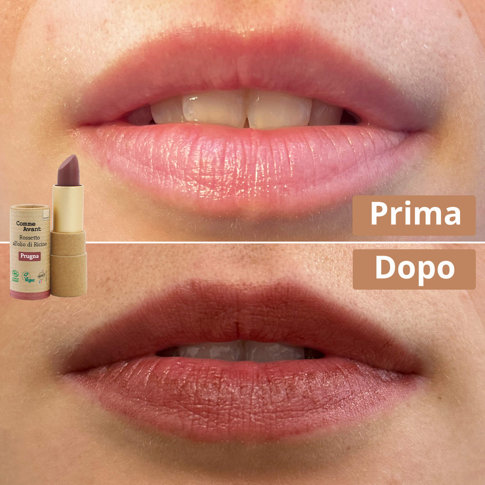Elenco INCI del rossetto Prugna: Astrocaryum Murumuru Seed Butter, Glyceryl Isostearate, Euphorbia Cerifera Cera, CI 77007, Ricinus Communis Seed Oil, Capryloyl Glycerin / Sebacic Acid Copolymer, Kaolin, CI 77491