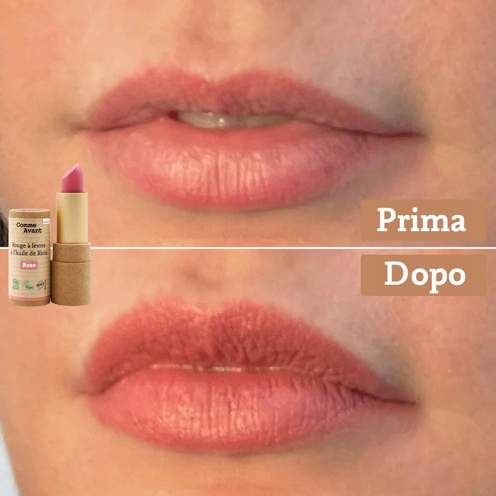 Elenco INCI del rossetto Rosa: Gliceril isostearato, ossido di zinco, burro di semi di Astrocaryum murumuru, cera di Euphorbia cerifera, copolimero di glicerina capriloil/acido sebacico, CI 77007, olio di semi di Ricinus communis, CI 77491, caolino.