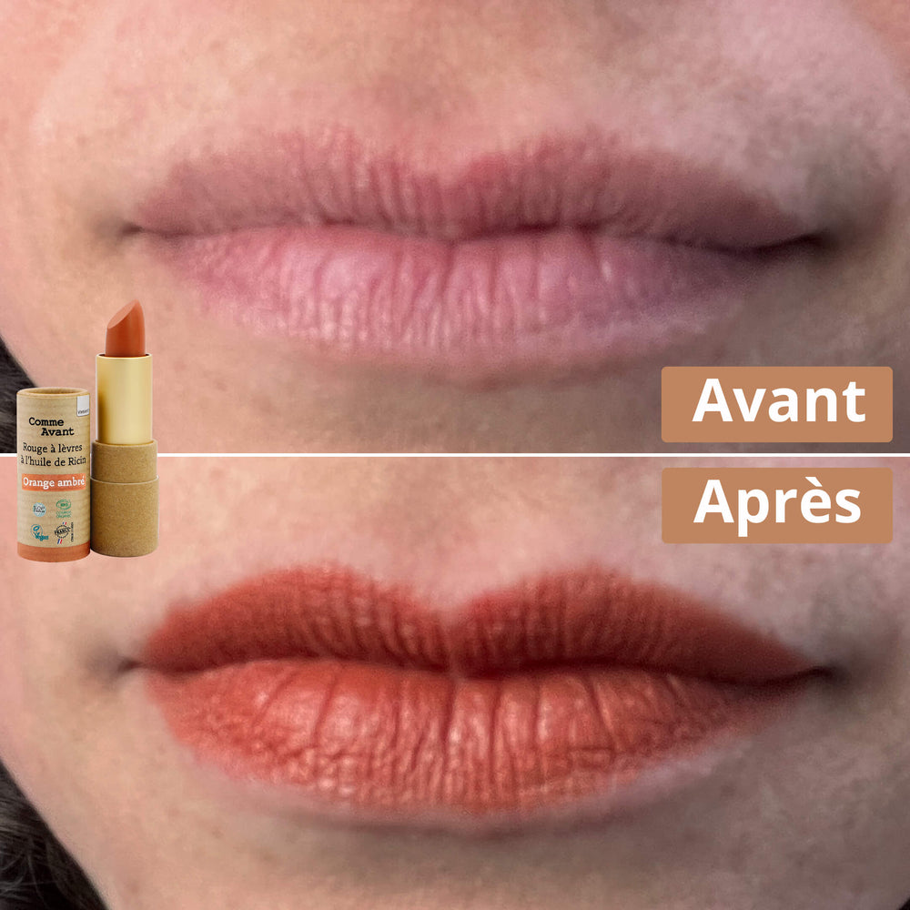 Elenco INCI del rossetto Arancione ambrato: Burro di semi di Astrocaryum Murumuru, Euphorbia Cerifera Cera, Gliceril Isostearato, CI 77492, Olio di semi di Ricinus Communis, Copolimero di Capriloil Glicerina/Acido Sebacico, CI 77491