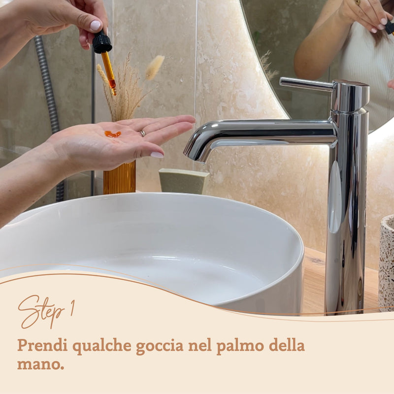 - Astaxantina: estratto da alghe marine, è un pigmento rosso naturale che contribuisce all'effetto aranciato del nostro siero. È uno dei principali ingredienti attivi di questo olio illuminante e, oltre al suo colore, offre potenti proprietà antinfiammatorie e antiossidanti.
